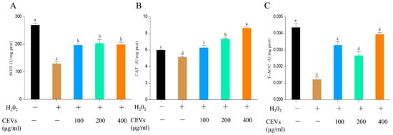 Determination of intracellular enzyme activity under different treatments of H2O2-induced oxidative stress in cells. SOD content and differences under different CEV concentration treatments (A); CAT content and differences under different CEV concentration treatments (B); T-AOC content and differences under different CEV concentration treatments (C). Values in the same row with different superscript letters are significantly different (p < 0.05).