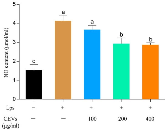 The content of cellular NO under different CEV concentration treatments after LPS induction. Values in the same row with different superscript letters are significantly different (p < 0.05).