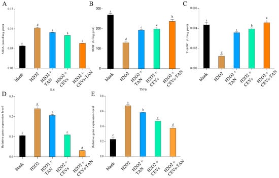 Determination of antioxidant indices and expression of anti-inflammatory factor levels in cells under CEVs-TAN treatment. Differences in MDA (A), SOD (B), and T-AOC (C) contents of cells treated with CEVs, TAN, and CEVs-TAN after hydrogen peroxide-induced oxidative stress; differences in IL-6 (D) and TNFα (E) gene expression in cells treated with CEVs, TAN, and CEVs-TAN after LPS-induced cell inflammation. Values in the same row with different superscript letters are significantly different (p < 0.05).