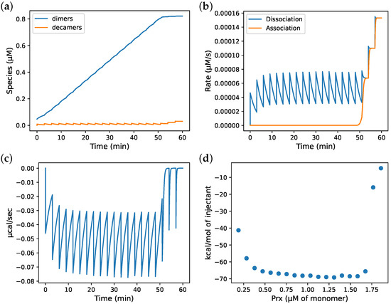 Determining kinetic constants requires time-based experimental data and, as far as we are aware, the only time-based (non-equilibrium) data available for Prx decamer dissociation are the ITC experiments of Barranco-Medina et al. [7]. Therefore, in order to characterise the association and dissociation constants of the Prx decamer, a kinetic model simulating the ITC experiments was developed. During development of the model, we used the exponent of 130 and a of 2.4 × 10−10 µM129 as published in the original study to validate our approach (as discussed below, we subsequently used an exponent of 5 and a of 1.1 µM4 when fitting the rate constants). With this model, ITC experiments with Prx were simulated allowing for the Prx species (Figure 3a) to be tracked and the rates (Figure 3b) of Prx decamer dissociation and association to be calculated over the time course of the experiment. Notably, the system behaviour changed around the 45 min mark, which corresponded to the ITC experiments of Barranco-Medina et al. [7] and the CTC. From the rates, the power (heat transferred per second) vs. time trace (Figure 3c) was calculated using: