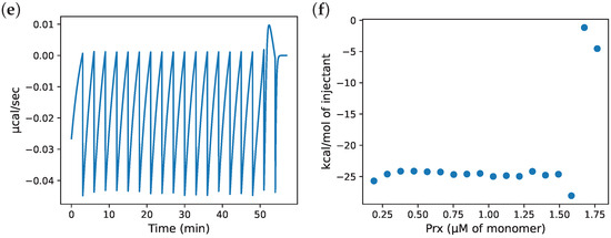 where P is the power and the known for Prx of 130–160 kcal/mol dimer was used in the simulations, depending on the Prx species [7]. The is often unknown when conducting an ITC experiment but can be determined from the P trace by finding the maximum area under the curve of all injections in an ITC experiment (Figure 3d).