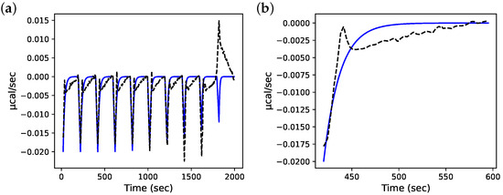 and the published value of [8]. The best-fit values from this procedure were a of 0.055 ± 0.0011 (S.E.) s−1 and a of 0.050 ± 0.0010 (S.E.) µM−4·s−1 (Figure 4a). Until the CTC was reached, each simulated injection produced a similar heat release vs. time profile and the model consistently under-estimated the data except at approximately 20 s after the injection, where the heat release was, instead, overestimated (Figure 4b).