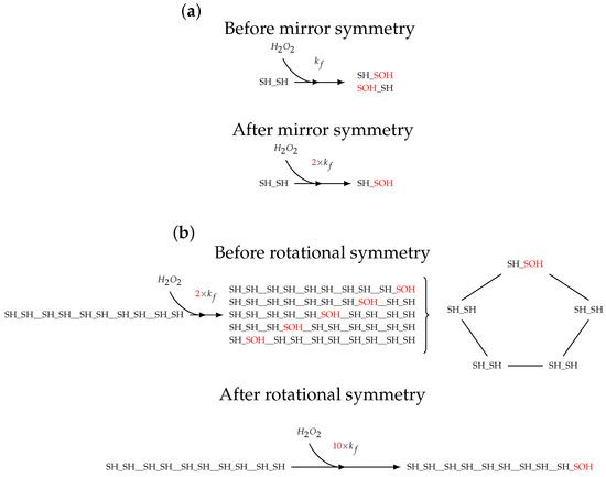 Scheme for scaling of rate constants by the amount of degeneracy (indicated by a red font colour) introduced from symmetry. (a) Degeneracy introduced by mirror symmetry within Prx dimers. Oxidation of one site in a reduced Prx dimer results in one of two products that are related by mirror symmetry. Therefore, the reactions can be collated into one reaction and the rate constant multiplied by a statistical factor of 2. This logic can be applied to the other reactions of Prx dimers. (b) Degeneracy introduced by rotational symmetry of Prx decamers. Taking mirror symmetry into account, oxidation of one site of a reduced Prx decamer results in 1 of 5 products that are related by rotational symmetry. Therefore, the reactions can be collated into one reaction with a statistical factor of 10. The same logic of symmetry can be applied to many of the Prx decamer species with other oxidation states, albeit resulting in less degeneracy.