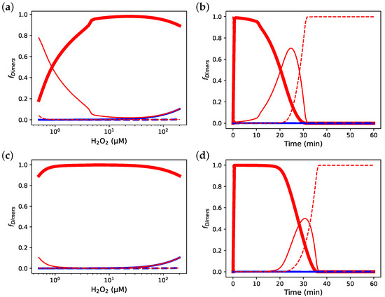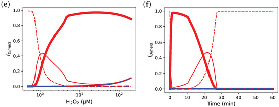 To investigate possible reasons for the reduction in peroxidase activity when incorporating the dimer–decamer transition, we calculated the disequilibrium ratio (, where Q is the reaction quotient) for the equilibrium between reduced dimers and decamers (Supplementary Material Section S6). While the system was under hydrogen peroxide stress, the proportion of the reduced dimeric Prx pool was greater than that of the same system at rest and the reaction was out of equilibrium (, see Figure S8a,c). Furthermore, we calculated the fraction of reduced sites in fully reduced and hetero-oxidised dimers. The hetero-oxidised dimers are unable to form decamers and, therefore, the reduced sites contained in them will have the corresponding low peroxidase activity of dimeric Prx. In simulated HRP and NADPH assays, this fraction of hetero-oxidised dimers increased upon hydrogen peroxide exposure (Figure S8b,d).