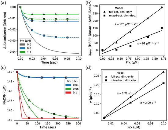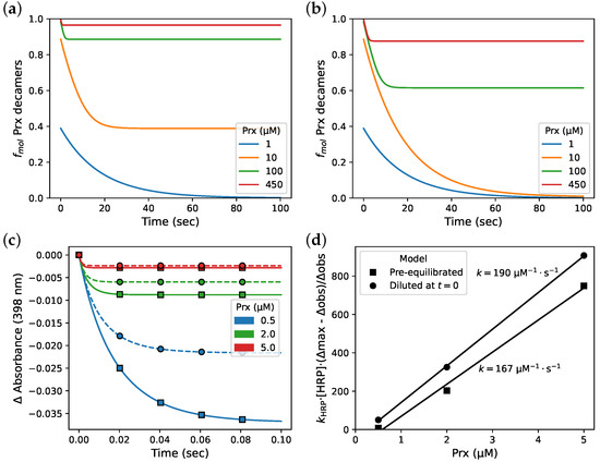 This equilibration is fast enough that a Prx solution would reach equilibrium after dilution in most laboratory applications, with the exception of HRP competition assays of the peroxidase activity of Prx, which can run to completion in approximately 100 ms [10,11,44]. To evaluate the extent that this affects assays of Prx peroxidase activity, we simulated an HRP competition assay (Figure 8c) using the mixed-activity dimer–decamer model and compared the hypothetical scenario of Prx dimers and decamers equilibrating instantly to the scenario of Prx dimers and decamers equilibrating as per their mass action kinetics following injection by a stopped-flow apparatus, i.e., dilution at . These traces show that an instantly equilibrated system is expected to have lower peroxidase activity than one that follows the dissociation kinetics, which is confirmed by the rate constants of 167 µM−1·s−1 and 190 µM−1·s−1 (Figure 8d), obtained from simulations with pre-equilibrated Prx and from those following the dissociation kinetics after dilution, respectively. Together, these results show that the equilibration of Prx following dilution can affect HRP competition assays when the time between dilution and assay is sufficiently short that the system cannot reach equilibrium, but should not affect most other assays, where there is a longer time between dilution and data acquisition.