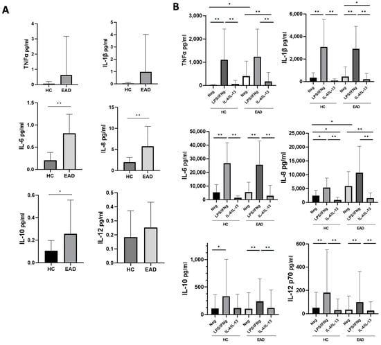 At basal (ex vivo) conditions, EADs showed increased plasma levels of all the cytokines analyzed in comparison to controls (Figure 1A), which were statistically significant for IL-6, IL-8, and IL-10 levels. After short-term whole-blood culture, unstimulated samples (negative control) from EADs showed significantly increased levels of TNF-α and IL-8 compared to those from healthy controls (Figure 1B). As expected, stimulation of whole blood with LPS/IFNγ induced a statistically significant increase in the production of the IL-1β, IL-6, and IL-12, as well as anti-inflammatory IL-10, compared to unstimulated whole blood samples in both HCs and EADs; the increase in soluble TNF-α and IL-8 was statistically significant only in controls. In turn, stimulation with IL-4/IL-13 induced a significant decrease in the production of both IL-1β and IL-8 in patients, and of IL-8 in controls, compared to unstimulated samples (Figure 1B).