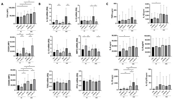 In regards to the surface expression of M1/M2 markers after short-term whole-blood culture, PB CD14+ monocytes displayed significantly increased expression of TNF-α as a surface marker after blocking its secretion (Figure 2A) when comparing the unstimulated samples from EADs with those from controls. TNF-α expression was significantly increased in both groups after LPS/IFNγ stimulation, but without differences (p > 0.05) in the intensity of expression between patients and controls. No differences were found in CD206 expression between the groups, but CD209 levels were significantly increased after LPS/IFNγ, and particularly after IL-4/IL-13 stimulation, compared to unstimulated samples. As shown in Figure 2B, PB CD14+ monocytes from unstimulated samples of EADs had significantly increased mRNA expression of pro-inflammatory cytokines, such as TNF-α, IL-1β, IL-12, and inducible nitric oxide synthase (iNOS), and decreased mRNA expression of arginase, compared to unstimulated CD14+ monocytes from controls. LPS/IFNγ stimulation increased the mRNA expression of NF-E2-related factor-2 (Nrf2), protein phosphatase 1-alpha catalytic subunit (PP1A), and vascular endothelial growth factor (VEGF) in both cases and controls, as well as chemokine C-X-C-motif ligand 1 (CXCL1) in the patients. TNF-α and iNOS mRNA expression was significantly higher after stimulation with LPS/IFNγ in EADs than in the controls. Finally, IL-4/IL-13 stimulation significantly reduced iNOS and IL-1β mRNA expression in EADs compared to unstimulated samples, but this reduction was not observed in the controls.
