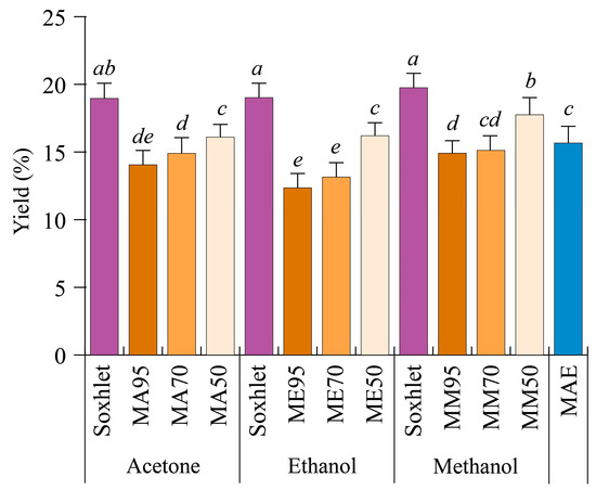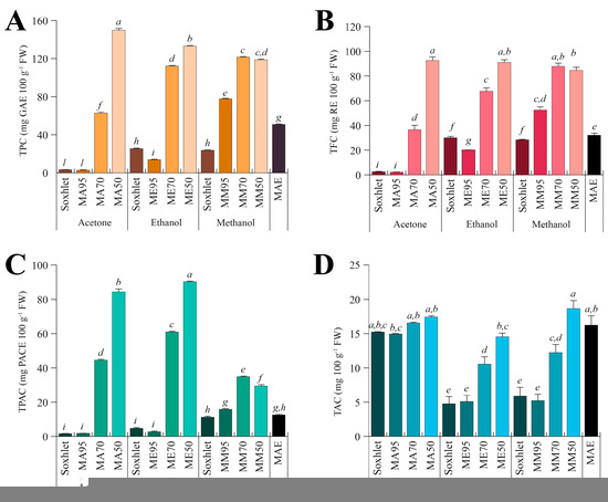 3.2. Acetone and Ethanol Are the Best Solvents for Flavonoids and Flavan-3-ols, whereas MAE Is More Efficient for N-Containing Compounds