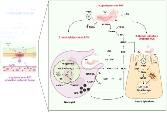 In addition to causing neutrophils to produce O2•−, H. pylori lipopolysaccharides (LPS) stimulate gastric epithelial cells to produce NOx by activating Toll-like receptor 4 (TLR4) on their surface [39,40]. There is also evidence that cytotoxic factors released by H. pylori, such as vacuolating cytotoxins, cytotoxin-associated genes (CagA), and peptidoglycan, promote oxidative stress in gastric epithelial cells [41]. Transfecting gastric epithelial cells with the cagA gene induced significant ROS production in the cells by locating a fraction of the CagA protein to the mitochondria [42]. Additionally, there is evidence that ROS production plays a role in accelerating the cell cycle and subsequent proliferation of cells [43].