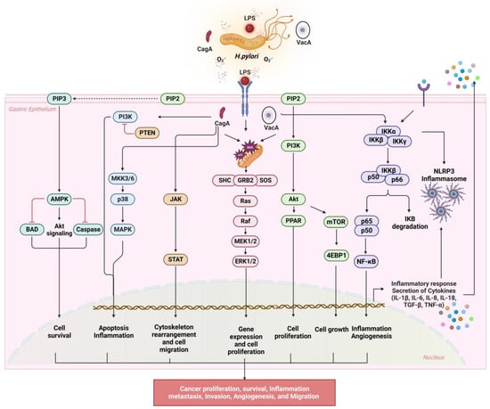 As mentioned above, H. pylori-induced oxidative stress response can trigger NF-κB pathway activation by releasing the virulence factors that activate the upstream kinases (IKK, NIK, and Akt), thereby causing the degradation of IκB or altering the nuclear translocation and transcription factor binding to DNA by modifying the heterodimers of the transcription factor.