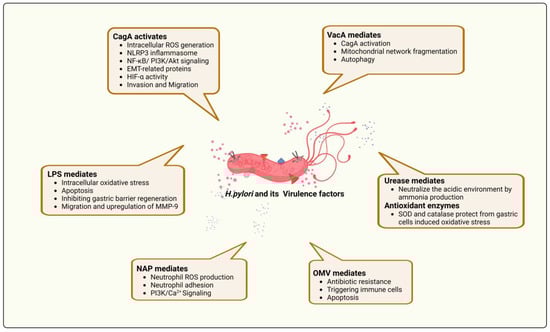 The virulence of an H. pylori infection causes prolonged inflammation in the gastrointestinal mucosa. Multiple virulence factors associated with H. pylori strains may contribute to oxidative stress in the host and appear to be a combination of three pathogenic mechanisms: colonization (involving the urease, adhesin, and flagellum chemotactic systems), resistance to immunity (i.e., flagellum, lipopolysaccharides (LPS), VacA, and CagA), and disease induction (DUpA, VacA, and BabA) [122] (see Figure 3). It is also possible to classify these virulence factors as effector proteins. The main effector proteins/toxins released by H. pylori include cytotoxin-associated genes (CagA), urease, blood group antigen-binding adhesions (BabA), vacuolating cytotoxins (VacA), outer inflammatory proteins (OIPA), outer membrane proteins, high-temperature requirement A (HtrA), sialic acid-binding adhesins (SabA), outer membrane vesicles (OMV), and neutrophil-activating protein A (NepA) [123].