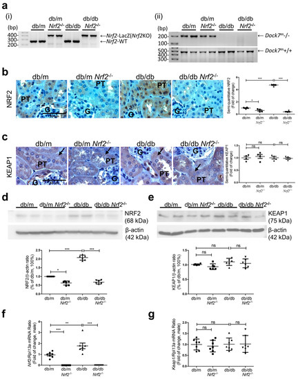 PCR analysis confirmed the presence of Nrf2 gene in the ear tissue of db/m and db/db mice but not in db/mNrf2−/−(KO) and db/dbNrf2 KO mice (Figure 1a (panel i)). Db/db mice are identified by the presence of the Dock7 gene, which was introgressed into a mutant leptin receptor (Figure 1a (panel ii)). Immunostaining for NRF2 was more pronounced in nuclei of RPTCs from db/db mice than in db/m mice and was not detectable in db/mNrf2 KO and db/dbNrf2 KO mice of both sexes (Figure 1b and Supplementary Figure S1a). In contrast, KEAP1 immunostaining results were similar in the groups studied (Figure 1c). NRF2 and KEAP1 expression in RPTs assessed via respective WB (Figure 1d,e and Supplementary Figure S1b) and RT-qPCR of Nrf2 and Keap1 (Figure 1f,g and Supplementary Figure S1c) were consistent with these findings.
