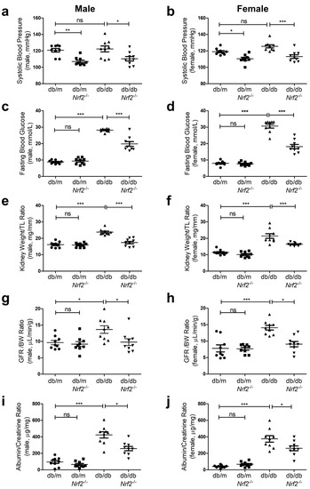 Effects of Nrf2 KO on physiological parameters of db/db Mice (male and female) at 16 weeks of age. (a,b) Systolic blood pressure (SBP); (c,d) fasting blood glucose (FBG); (e,f) KW/tibial length (TL) ratio; (g,h) glomerular filtration rate (GFR); and (i,j) albumin–creatinine ratio (ACR) from db/m, db/mNrf2 KO, db/db, and db/dbNrf2 KO mice. Values are mean + SEM; n = 9 per group. Statistics were obtained via one-way ANOVA followed by Bonferroni post hoc test. * p < 0.05; ** p < 0.01; *** p < 0.005; ns, not significant.