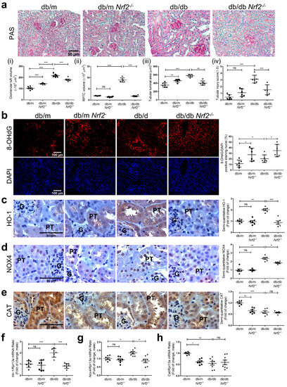 Significantly stronger staining for 8-OHdG (Figure 3b) and DHE (Supplementary Figure S3) was detected in RPTs of db/db vs. db/m and db/mNrf2 KO mice, but it did not differ from that in db/dbNrf2 KO mice. In contrast, immunostaining for HO-1 (Figure 3c) and NOX-4 (Figure 3d) in RPTs were significantly increased in RPTs from db/db mice compared to db/m and db/mNrf2 KO mice, whereas these changes were attenuated in db/dbNrf2 KO mice. In contrast, CAT immunostaining was significantly higher in RPTs of db/m than in db/mNrf2 KO, db/db, or db/dbNrf2 KO mice (Figure 3e). These findings were confirmed via semi-quantification of 8-OHdG (Figure 3b) and DHE (Supplementary Figure S3) staining and immunostaining for HO-1 (Figure 3c), NOX-4 (Figure 3d), and CAT (Figure 3e) as well as via RT-qPCR for HO-1 (Figure 3f), Nox-4 (Figure 3g), and Cat (Figure 3h) from isolated mouse RPTs.