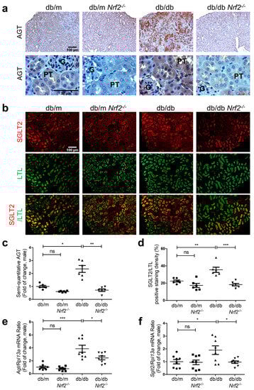 AGT and SGLT2 expression in male db/db mouse kidneys at week 16 immunohistochemical staining of AGT (a), immunofluorescent staining of SGLT2 and LTL (b), semi-quantification of AGT immunostaining (c), and SGLT2/LTL ratio (d) in mouse kidneys. RT-qPCR analysis of Agt (e) and Sglt2 (f) levels in RPTs of db/m, db/mNrf2 KO, db/db, and db/dbNrf2 KO mice. Values are expressed as mean ± SEM; n = 6 per group for staining; n = 8 per group for mRNA expression. Statistics were obtained via one-way ANOVA followed by Bonferroni post hoc test. * p < 0.05; ** p < 0.01; *** p < 0.005 vs. db/m; ns, not significant.