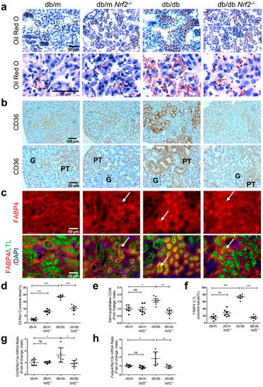 Oil Red O staining increased in renal tubules of db/db vs. db/m mice (Figure 5a), and this was markedly decreased in the renal tubules of db/dbNrf2 KO mice. Immunostaining of CD36 revealed higher expression in RPTs from db/db vs. db/m and db/mNrf2KO mice (Figure 5b), whereas db/dbNrf2KO mice exhibited lower CD36 expression than db/db mice. Similar changes were detected for FABP4 immunostaining, with significant increases in db/db vs. db/m mice (Figure 5c), whereas FABP4 immunostaining was lower in db/dbNrf2KO mice than in db/db mice. Semi-quantitation of Oil Red O staining (Figure 5d), CD36 (Figure 5e), and FABP4 (Figure 5f) immunostaining, and RT-qPCR of CD36 (Figure 5g) and Fabp4 (Figure 5h) confirmed these observations.