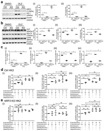 AGT, SGLT2, and CD36 expression in HK2 with or without NRF2 KO WB and semi-quantitation of NRF2 and HO-1 (a) (i) NRF2; (ii) HO-1 and (b) (i) AGT; (ii) SGLT2 and (iii) CD36 in different clones of HK2 with or without NRF2 KO via CRISPR gRNA in the presence or absence of 45 µM oltipraz (OLZ). (c) RT-qPCR of HO-1 (i), AGT (ii), SGLT2 (iii), and CD36 (iv) in HK2 with or without NRF2KO cultured ± Olz added. (d) RT-qPCR of AGT, SGLT2, and CD36 in HK2 without NRF2 KO ((i), (ii), and (iii), respectively), and (e) RT-qPCR of AGT, SGLT2, and CD36 in HK2 with NRF2 KO ((i), (ii), and (iii), respectively) cultured in normal glucose (NG, 5 mM D-glucose + 30 mM D-mannitol) or high glucose (HG, 35 mM D-glucose) ± palmitate/oleate (200 µM). Experiments were repeated at least 3 times in duplicates. Values are mean ± SEM; n = 3. Statistics were obtained via one-way ANOVA followed by Bonferroni post hoc test. * p < 0.05, ** p < 0.01, *** p < 0.005; ns, not significant. HK2NRF2 KO versus HK2 control (Ctrl). Note: Student t-test was used to analyze HK2NRF2 KO versus Ctrl with the treatment of DMSO in (b(i,iii)). * p < 0.05; *** p < 0.005.