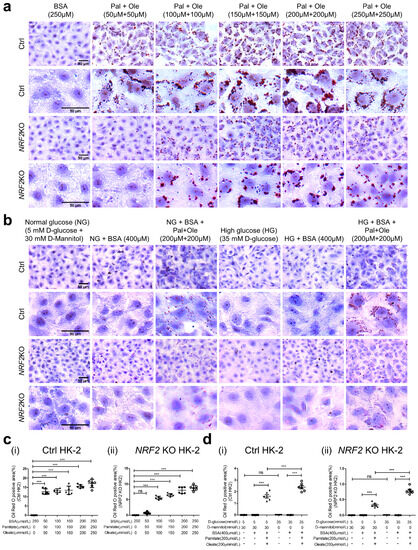 Oil Red O Staining in HK-2 with or without NRF2 KO. (a) Oil Red O staining in HK2 with or without NRF2 KO cultured in NG in FFA-depleted BSA or different concentrations of FFA (palmitate/oleate). (b) Oil Red O staining in HK2 with or without NRF2 KO cultured in NG or HG ± FFA-depleted BSA (400 µM) or palmitate (200 µM)/oleate (200 µM). (c) and (d) Semi-quantification of Oil Red O staining in (i) HK2 control or (ii) HK2 with NRF2 KO cultured in NG or HG ± FFA-depleted BSA or palmitate/oleate. Values are mean ± SEM; n = 3. Statistics were obtained via one-way ANOVA followed by Bonferroni post hoc test. *** p < 0.005; ns, not significant. HK2NRF2 KO versus HK2 control (Ctrl).