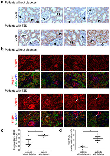 CD36 and FABP4 expression in human kidney sections. Samples were obtained from areas without tumors from patients who underwent nephrectomy for carcinoma of the kidney. CD36 immunostaining (a) and FABP4/LTL/DAPI immunofluorescent staining (b) from 4 patients without diabetes and from 4 patients with diabetes (white arrows indicate proximal tubules). (c) Semi-quantitation of CD36 and (d) FABP4/LTL/DAPI staining from patients ± diabetes. CD36 magnification ×200 and FABP4 magnification ×100. G, glomerulus; and P, proximal tubule. * p < 0.05; ** p < 0.01 vs. Patients without diabetes (Student’s unpaired t-test).