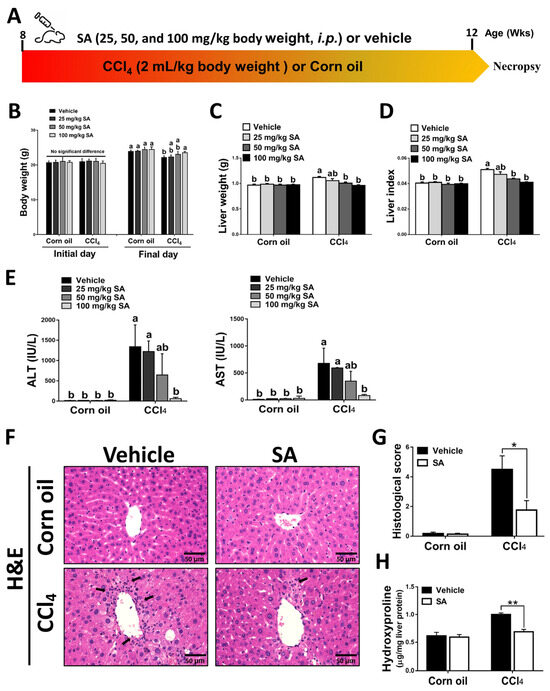 Sappanone A (SA) treatment ameliorates the severity of CCl4-induced liver injury in mice. (A) Mice were administered with CCl4 (2:5 v/v in corn oil, 2 mL/kg, i.p.) or an equal volume of corn oil three times a week for 4 weeks. Meanwhile, mice in each group were treated with SA (25, 50, and 100 mg/kg body weight, i.p.) or an equal volume of vehicle every other day. (B–D) The body weight and liver weight were monitored, and the liver index was calculated. (E) Serum ALT and AST levels were evaluated. (F) H&E staining. (G) The necrotic lesions in H&E-stained liver sections were scored. (H) Hepatic hydroxyproline levels were quantified. Data in each group are displayed as means ± SD. (B–E) Differences among multiple groups were analyzed with ANOVA followed by Tukey’s post hoc analysis. If there is at least one identical letter in the symbols of compared groups, there is no statistically significant difference between these groups. If there is no common letter in the compared groups, then the means between these groups are statistically different. (G,H) Differences between the two groups were compared by two-tailed Student’s t-test, * p < 0.05 and ** p < 0.01. Corn oil-treated groups (n = 8); CCl4-treated group (n = 10). Original magnification: ×400. The arrows in the picture show areas of inflammation or necrosis.