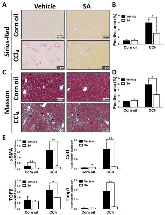 Next, we determined whether SA has anti-fibrotic effects on CCl4-induced liver fibrosis. As shown in Figure 2A–D, Sirius Red and Masson staining of liver sections showed that a significant improvement in liver fibrosis was found in SA-treated fibrotic mice compared with the vehicle-treated mice, leading to thinner and less pronounced fibrous septa with frequent perforation. Consistently, treatment of SA reduced the expression of profibrogenic genes in the livers of fibrotic mice, including Asma, TGFβ, Col1, and Timp1 (Figure 2E). Overall, SA has anti-fibrotic properties in CCl4-induced liver fibrosis.