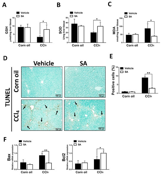 The clinical and experimental data indicated that oxidative stress mediated the progression of liver fibrosis because continuous oxidative insults induce hepatocyte death, subsequently resulting in hepatic inflammation and fibrosis [32]. In this study, the data showed that SA treatment notably up-regulated hepatic levels of GSH and SOD and, in parallel, reduced MDA contents in fibrotic livers (Figure 3A–C). Consistently, the TUNEL assay and analysis of TUNEL-positive cells (Figure 3D,E) revealed that SA treatment significantly lessened CCl4-induced hepatocyte cell death. Also, SA down-regulated the expression level of Bax while SA up-regulated the expression level of Bcl2 in injured livers (Figure 3F).