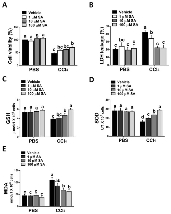 Consistent with the in vivo study, SA treatment statistically attenuated CCl4 stimulation-mediated hepatocyte injury (Figure 4A,B). Parallelly, SA-treated hepatocytes revealed increased levels of GSH and SOD with a concurrent reduction in MDA level (Figure 4C–E).