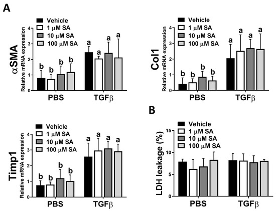 Since the activation of HSCs is a pivotal stage in the development of liver fibrosis, and our in vivo results showed that SA treatment reduces ECM accumulation in fibrotic livers, we next evaluated whether SA directly affects the activation of HSC. Unexpectedly, SA treatment could not affect the expression levels of fibrotic-related genes, including αSMA, Col1, and Timp1 in TGFβ-treated HSCs (Figure 5A). Furthermore, SA could not induce cell death of inactivated or activated HSCs (Figure 5B). Thus, our data indicated that SA could not directly affect HSC activation.