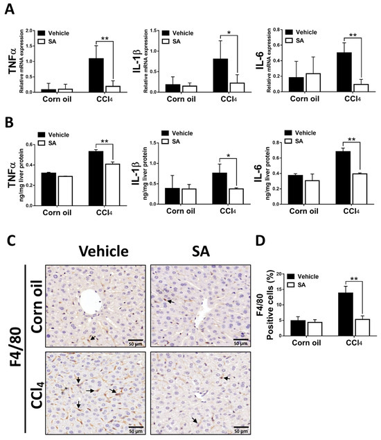 Liver fibrosis is generally preceded by chronic inflammation, and continuous inflammatory responses drive the progression of liver fibrosis [33]. SA-provided effects on CCl4-evoked hepatic inflammation were evaluated as the expression of key pro-inflammatory cytokines and macrophage infiltration. As we expected, animals from the SA-treated group exhibited significantly decreased mRNA and protein levels of TNFα, as well as IL-1β and IL-6 (Figure 6A,B). In line with these results, treatment with SA reduced the infiltration of F4/80 positive macrophages in fibrotic livers. Altogether, the data suggest that SA treatment decreases the pro-inflammatory environment in the liver.