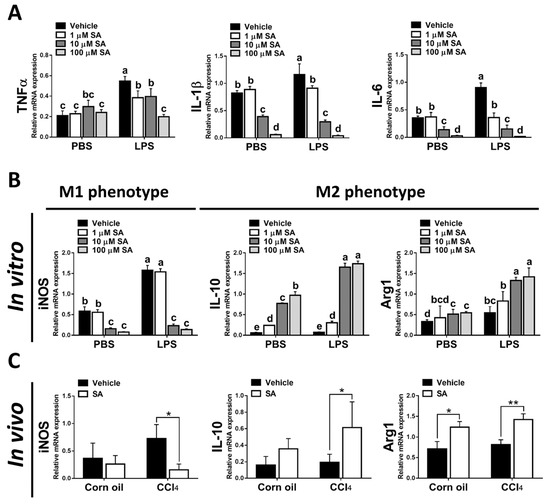 It is well known that hepatic macrophages are activated in response to hepatocyte death, and M1 macrophage polarization plays a key role in the progression of liver fibrosis [34]. Therefore, we evaluated whether SA affects the activation of macrophages. Similar to in vivo results, treatment with SA markedly downregulated the mRNA expression of TNFα, IL-1β, and IL-6 in macrophages with or without LPS stimulation (Figure 7A), and the concentrations of SA used did not affect the cell viability (Supplementary Figure S3). It is well documented that macrophages stimulated with LPS undergo M1 polarization [35]. Consistently, LPS stimulation robustly increased the expression of nitric oxide synthase (iNOS, an M1 polarization marker) but diminished the mRNA expression of Interleukin 10 (IL-10) and arginase 1 (Arg1) (M2 polarization markers) in macrophages. After SA administration, reduced expression of iNOS and elevated expression of IL-10 were observed in macrophages with or without LPS stimulation, while increased expression of Arg1 was only found in LPS-treated macrophages (Figure 7B). Consistent with in vitro results, treatment with SA inhibited the M1 polarization marker and enhanced the M2 polarization markers in fibrotic livers (Figure 7C). Additionally, treatment with SA reduced the infiltration of CD86-positive macrophages (M1 macrophage polarization marker) and increased the infiltration of CD163-positive macrophages (M2 macrophage polarization marker) in fibrotic livers (Figure 7D–G).