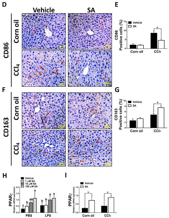 Sappanone A (SA) treatment could relieve inflammatory responses by PPARγ-mediated macrophage polarization. To demonstrate whether SA exerts anti-inflammatory properties, the RAW 264.7 cell line was treated with SA (1, 10, and 100 μM) at 30 min after LPS (1 μg/mL) stimulation (n = 8 wells/group). At 24 h after LPS treatment, cell samples and supernatants were collected. (A) The mRNA expression of TNFα, IL-1β, and IL-6 in cells was measured by qRT-PCR. The mRNA expression of iNOS (M1 phenotype maker) or IL-10 and Arg1 (M2 phenotype makers) in cells (B) and livers of mice (C) was evaluated by qRT-PCR. The CD86-positive macrophages (D,E) and CD163-positive macrophages (F,G) in liver slides were stained with IHC staining. PPARγ mRNA level was measured in cells (H) and livers of mice (I) by qRT-PCR. Data in each group are presented as means ± SD. (A,B,H) Differences among multiple groups were analyzed with ANOVA followed by Tukey’s post hoc analysis. If there is at least one identical letter in the symbols of compared groups, there is no statistically significant difference between these groups. If there is no common letter in the compared groups, then the means between these groups are statistically different. (C,E,G,I) Differences between the two groups were compared by two-tailed Student’s t-test, * p < 0.05 and ** p < 0.01. Corn oil-treated groups (n = 8); CCl4-treated group (n = 10). Original magnification: ×400. The arrows in the picture show the positive-cells.