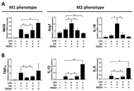 Modulation of PPARγ by sappanone A (SA) treatment affects macrophage polarization in RAW 264.7 cells. The RAW 264.7 cells were treated with 2 μM SR202 and/or 100 μM SA at 30 min and 1 h after LPS (1 μg/mL) treatment. SR202 was used to inhibit the activity of PPARγ. At 24 h after LPS stimulation, cells and supernatants were collected. (A) The mRNA level of iNOS (M1 phenotype maker) or IL-10 and Arg1 (M2 phenotype makers) in cells was evaluated by qRT-PCR. (B) The mRNA expression of TNFα, IL-1β, and IL-6 in cells was measured by qRT-PCR. Data in each group are expressed as means ± SD (n = 8 wells/group). * p < 0.05 and ** p < 0.01.