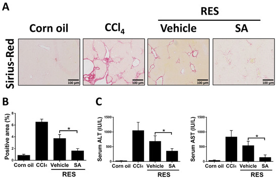 Since the above results showed that SA restrained the progression of hepatic fibrosis, we explored the effects of SA on fibrosis resolution by injecting with CCl4 for 4 weeks, followed by treating SA (100 mg/kg) for 2 weeks (RES group; total 6 weeks). Compared with the 4-week CCl4-injected group, Sirius Red staining showed that the RES group showed significantly decreased hepatic fibrosis and that such effects were further accelerated by treatment with SA (Figure 9A,B). Furthermore, treatment with SA markedly reduced serum ALT and AST levels in mice during fibrosis regression (Figure 9C). Collectively, the data indicate that SA can assist in the resolution of liver fibrosis in mice.