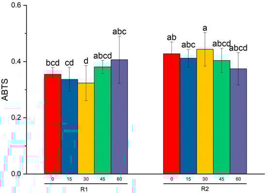 The results of Tukey’s test (significant level p < 0.05) and two-way ANOVA on the ABTS average level (± SD) for raspberries. Ozonation time and varieties were two factors used in tests. Different letters indicate significant differences between the means (p < 0.05).