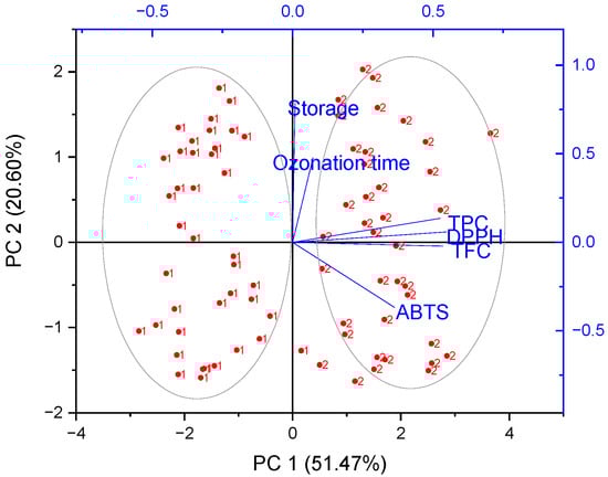 Biplot form of Principal Component Analysis (PCA) of the phenolic content (TFC, TPC), antioxidant capacities (DPPH and ABTS), ozonation time and storage condition of two species of strawberry (1—Portola and 2—Enduro): 2D projection.