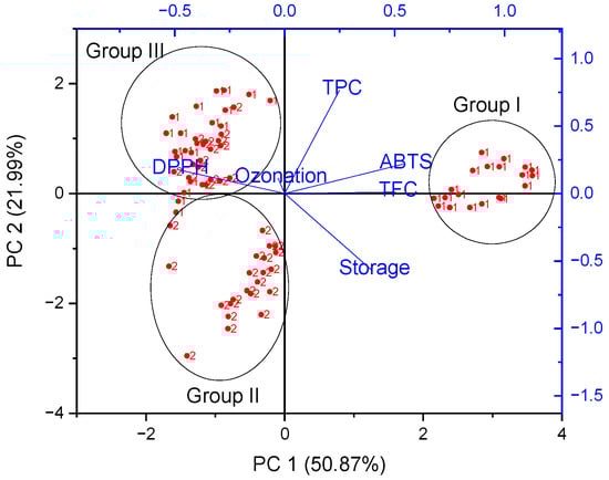 Through the analysis of strawberries, score plots showed clustering effects, forming three separate groups (I–III). The first cluster was represented by selected samples of the Portola variety, the second cluster presents selected samples of the Enduro variety, while the third cluster forms a common group for both varieties. PC1 divided Portola samples (1) into two groups (I and III), which may be related to different storage methods. Moreover, PC2 also divided Enduro (2) samples into two groups (II and III). In the case of strawberries, not only did the variety affect the differentiation of samples, but also the storage condition. A strong positive correlation between TFC and ABTS can be seen (on the right), indicating that samples with the highest potency in scavenging the ABTS radical presented the highest TFC, namely group I. On the other hand, DPPH (on the left) showed a negative correlation to ABTS and TPC. The time of ozonation was in the middle of the graph and did not affect the division of strawberry samples.