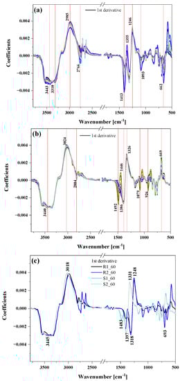 The FTIR spectra of the puree samples showed absorption bands at various frequencies that were related to the presence of various functional groups that are part of the chemical compounds present in food samples, such as alcohols, phenols, aldehydes, sugars and amino acids. To facilitate the analysis, discussion and comparison of the results obtained, the spectra were pre-processed using the first derivative (Figure 4). After the pre-processing, the FTIR spectra of all raspberry and strawberry purees with the most variability could be observed at around 3600–3100 cm−1, 3100–2800 cm−1 and 1500–1050 cm−1 (Figure 4a–c).