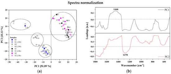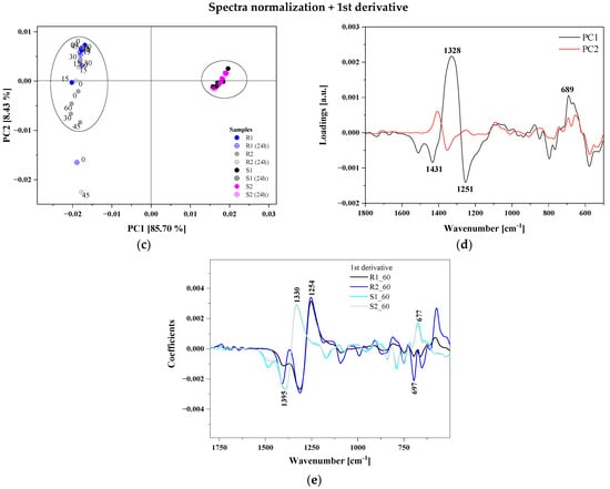 Results of PCA analysis: normalized data panel (a) PCA 2D score plots (PC1 vs. PC2), and panel (b) PC1 and PC2 correlation loading plots; the pre-processed spectra (normalization + 1st derivative) panel (c) PCA 2D score plots (PC1 vs. PC2), and panel (d) PC1 and PC2 correlation loading plots for the raspberry and strawberry samples (for the region 1800–500 cm−1). Comparison of two selected samples of raspberries (R1, R2) and strawberries (S1, S2) after 60 min of the ozonation—panel (e).