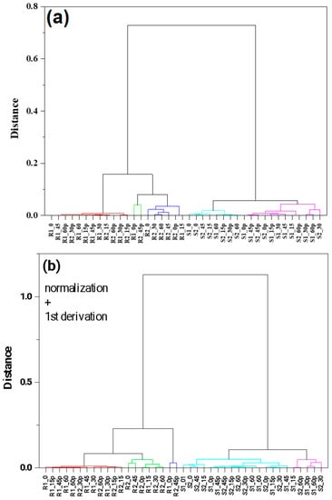 HCA analysis for the raspberry and strawberry samples for the region 1800–500 cm−1. Cluster method—group average. Clustering metric—Pearson correlation. Different colors indicate similarity cluster. Normalization at 3220 cm−1 (panel (a)), normalization + smoothing with 20 windows + 1st derivative (panel (b)).