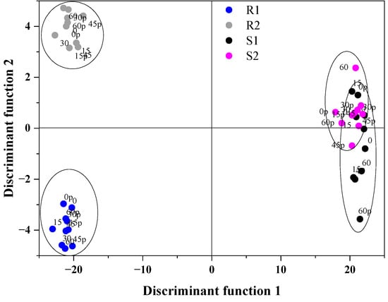 Linear discriminant score plot: R1—raspberries Enrosadira, R2—raspberries Kwazi, S1—strawberries Portola, S2—strawberries Enduro.