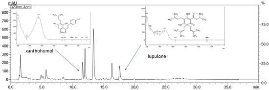 The chromatographic analysis was performed using high-performance liquid chromatography with the diode array detector (HPLC-DAD) method (Shimadzu Corp., Kyoto, Japan). The determination was performed with a validated method using the stationary phase: column of ReproShell PFP (150 mm × 4.6 mm; 2.7 µm). The mobile phase was composed of 0.1% trifluoroacetic acid (A), and methanol (B) with a gradient elution of 0–5 min B: 50–60%, 5–15 min B: 60–70%, 15–20 B: 70%, 20–25 min B: 70–80%, 25–30 min B: 80–85%, 30–35 min B: 85%. The flow rate was set at 1.0 mL/min, and the column temperature was 40 °C. The injection volume was 10.0 µL, whilst the detection wavelength was set at 323 nm. The retention time of xanthohumol was approx. at 11.7 min, whilst for lupulone it was at 17.6 min (Figure 1). The results were obtained and processed by LabSolutions LC software (version 1.86 SP2, Shimadzu Corp., Kyoto, Japan).
