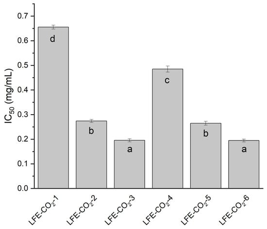 The chelating ability was presented as IC50, and thus, the smaller the result, the greater the potential of the extract (Figure 2). At least twice-better results were obtained in the scCO2 group than in the post-scCO2 ethanol group (Supplementary Materials, Table S2). The higher the temperature, and, more importantly, the higher the pressure used during extraction, the better the chelating properties of the extract. The most outstanding results were noticed for LFE-CO2-6 (0.195 ± 0.006 mg/mL) and for LFE-CO2-3 (0.196 ± 0.006 mg/mL), which were statistically better than other extracts obtained under lower pressure. The results obtained for ethanol extracts of the remaining plant material after scCO2 extraction were noticeably worse than for scCO2. Among the post-scCO2 ethanol group, the best result was 0.887 ± 0.011 mg/mL for rLFE-EtOH-4. Nevertheless, all of the results were greater than for a reference substance, quercetin, whose IC50 is 1.46 mg/mL (calculated as prepared concentration) [30].