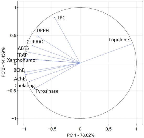 Contributions of variables (xanthohumol, lupulone content, TPC, ABTS, DPPH, FRAP, CUPRAC, chelating, AChE, BChE, tyrosinase) to PCs.