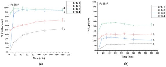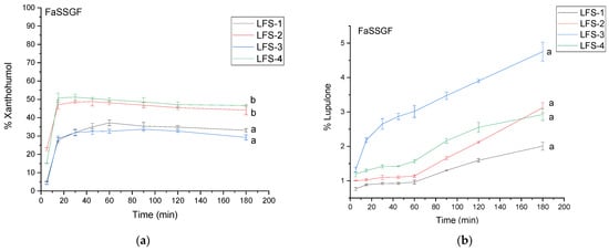The dissolution profile of xanthohumol (a) and lupulone (b) in LFS 1–4 in FaSSIF. Profiles with different letters differ significantly.