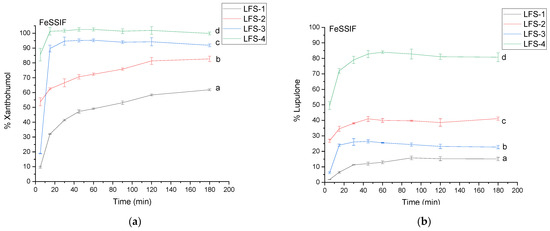 Xanthohumol is more soluble in acidic conditions than lupulone (Figure 4), reaching a maximum dissolution rate of 51.20 ± 1.59% in 30 min in LFS-4; however, xanthohumol undergoes degradation in acidic conditions as the profiles decrease after the first 30 min of the study. The literature confirms that prenylflavanoids are unstable at acidic pH [52]. LFS-3, and LFS-4 provided significantly better dissolution profiles than systems LFS-1 and LFS-2.