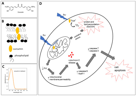 Curcumin chemical structure (A), location of curcumin in the membrane (B), absorption spectrum of curcumin (10 µM) in methanol in 380–700 nm range (C), scheme of phototoxic action of curcumin (D). Curcumin localizes in the plasma and inner mitochondrial membranes. Upon blue light absorption, curcumin undergoes activation and eventually forms an excited triple state (3cur*). In the presence of oxygen in a Type II photosensitized reaction, due to energy transfer between 3cur* and oxygen, singlet oxygen (1O2) is produced as ROS. As a result of 1O2-induced oxidative stress, protein and lipid peroxidation occurs, forming, for example, cholesterol hydroperoxides (mainly 5αOOH). In mitochondrial membranes, where mainly cardiolipin is peroxidized, oxidative stress leads to a decrease in membrane potential, an increase in membrane permeability and release of cytochrome c. This activates caspase 9 and Apaf-1. Both caspase 8 and caspase 9 lead to activation of caspase 3 and caspase 7 and consequently to cell apoptosis.