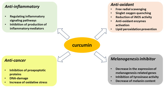 Curcumin affects multiple signaling pathways that regulate survival, cell proliferation, apoptosis and tumor suppressor pathways [68]. Based on this, it was concluded that curcumin inhibits the processes of the initiation, progression and metastasis of cancer cells [2]. Indeed, it seems that curcumin’s effect on cancer cells is universal because it has been shown to be effective in breast, lung, prostate, pancreatic, oral and colorectal cancers, as well as in multiple myeloma and squamous cell carcinoma of the head and neck [2]. The regular dietary intake of turmeric by Southwest Asian people is thought to be associated with their lowest incidence of most types of cancer [68]. Curcumin promotes apoptosis by inhibiting the mitochondrial anti-apoptotic proteins BCL-2 and XIAP, which leads to an increased expression of the pro-apoptotic proteins BAX and BAK [68] and changes in the mitochondrial membrane permeability. However, the use of curcumin is limited by its low solubility, rapid metabolism, poor bioavailability, low bioactive absorption and low targeting efficacy, among other factors [2]. To increase efficacy, curcumin can be combined with other anticancer drugs such as 5-fluorouracil, oxaliplatin or gemcitabine [69]. Another approach is to use other methods and forms of curcumin delivery, such as nanoparticles, powder or capsules [2]. The formulation of curcumin into nanoparticles (referred to as nanodiscs, NDs) facilitates its water solubility, and increases curcumin’s binding capacity and targeting potential, which enhance its therapeutic effects [70]. The summary of the most important protective activities of curcumin is presented in Figure 2.