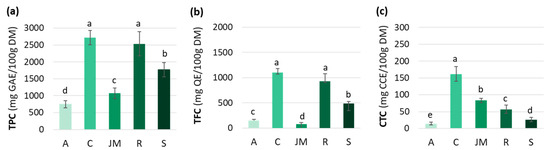 (a) Total phenolic content (TPC), (b) total flavonoid content (TFC), and (c) condensed tannin content (CTC) of amaranth (A), cassava (C), jute mallow (JM), roselle (R) and spinach (S) leaves. GAE: gallic acid equivalent; QE: quercetin equivalent; CCE: cyanidin chloride equivalent; DM: dry matter. Data are expressed as the mean ± SD (TPC (n = 33); TFC/CTC (n = 9)). Error bars indicate the SD. Different letters above the bars indicate significant differences (p < 0.05; LSD or Games–Howell test).