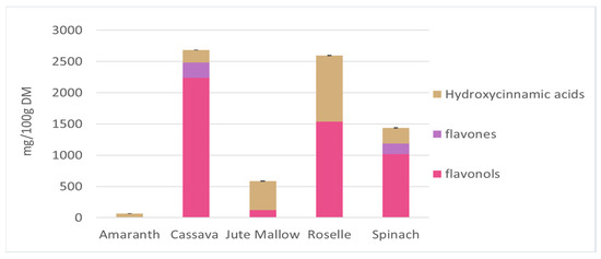 Different phenolic compounds from the three main classes of hydroxycinnamic acids, flavonols, and flavones identified in polar extracts of amaranth, cassava, jute mallow, roselle, and spinach leaves. Hydroxycinnamic acids are expressed as caffeic acid equivalent and flavonols/flavones as quercetin-3-O-glucoside equivalent. Data are the mean ± SD of three replicates. Error bars indicate the SD of the sum of the phenolic compounds classes.