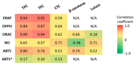 Pearson’s correlation coefficients (r) between antioxidant capacity (FRAP, DPPH, ORAC, ABTS, NO scavenging assays) and TPC, TFC, CTC, β-carotene, and lutein content. TPC: total polyphenol content, TFC: total flavonoid content, CTC: condensed tannin content. ABTS*: including the values for amaranth leaf extracts.